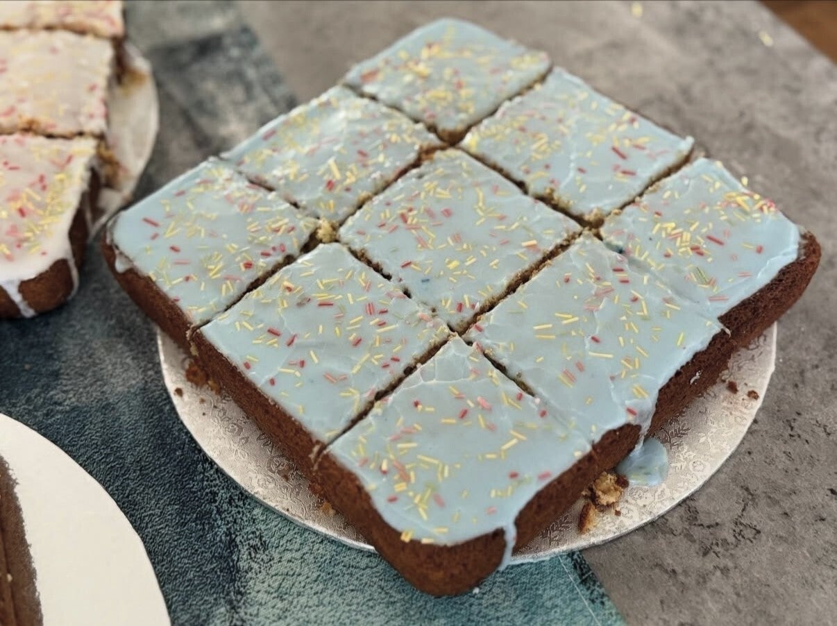 The iconic fluffy vanilla sponge topped with icing and sprinkles.